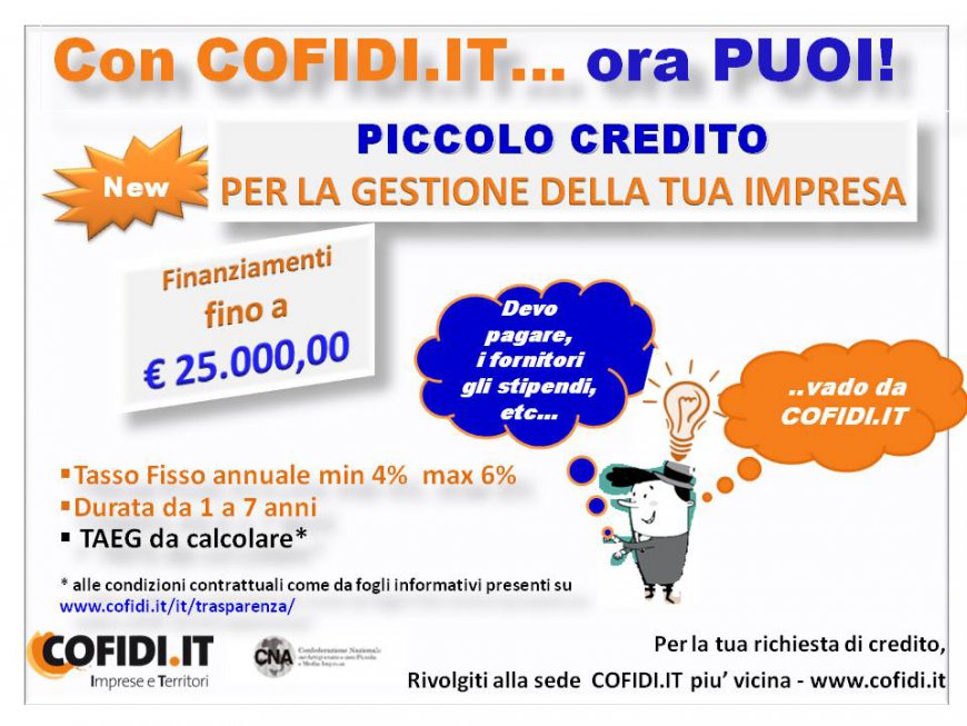 PICCOLI FINANZIAMENTI diretti alle piccole e medie imprese erogati direttamente da COFIDI.IT fino a 25.000,00 euro per supportare le loro esigenze di credito veloce, a tasso fisso annuale min 4% max 6% - durata da 1 a 7 anni - TAEG da calcolare *.