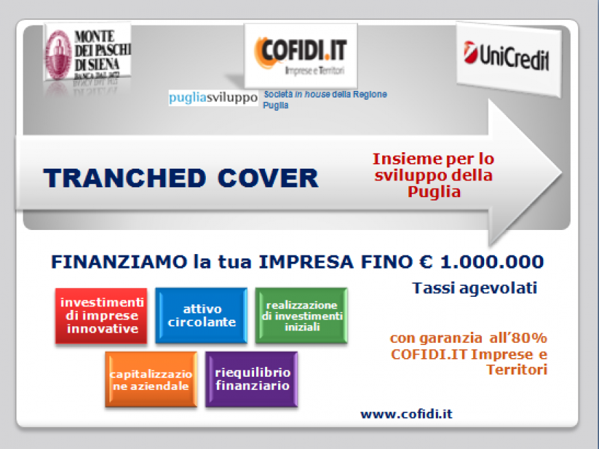 COFIDI.IT con Monte dei Paschi di Siena sono ormai prossimi al traguardo dei 62.500,00 milioni di euro del portafoglio creditizio fissato dal 2° Avviso del Fondo Tranched Cover, strumento di ingegneria finanziaria di Puglia Sviluppo società in house della Regione Puglia - Assessorato allo Sviluppo Economico della regione Puglia, in scadenza il 30-06-2015. Da Maggio 2014 al 30-10-2015, COFIDI.IT con MPS ha raggiunto l’obiettivo di € 55.000.000 di finanziamenti concessi alle imprese piccole e medie pugliesi per lo sviluppo della propria attività imprenditoriale.