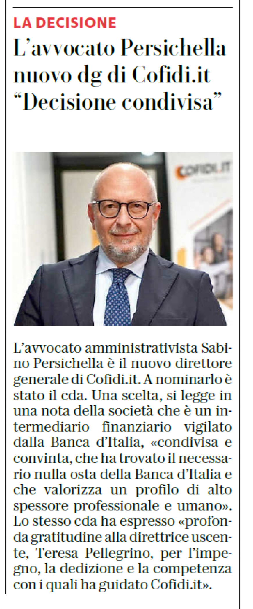 Repubblica - articolo Sabino Persichella nuovo Direttore Generale - 19 febbraio 2026
